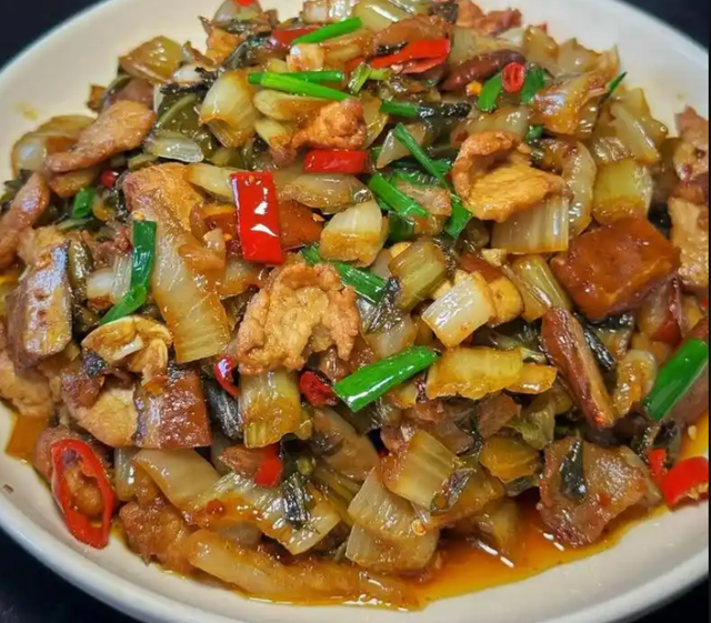 酸菜炒腊肉,酸菜的酸味与腊肉的香味相趋承,炒制后的菜肴色香味俱佳,吃上一口,厉害的香气扑鼻而来,令东说念主洗浴。