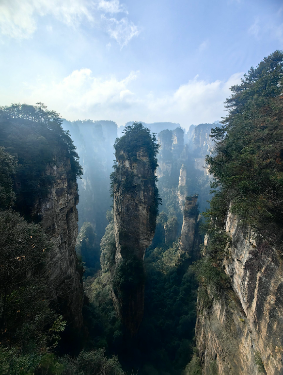 黄石寨是张家界最有代表性的景点之一,站在这里,山顶的奇峰怪石和绿色的丛林映入眼帘,声势磅礴。