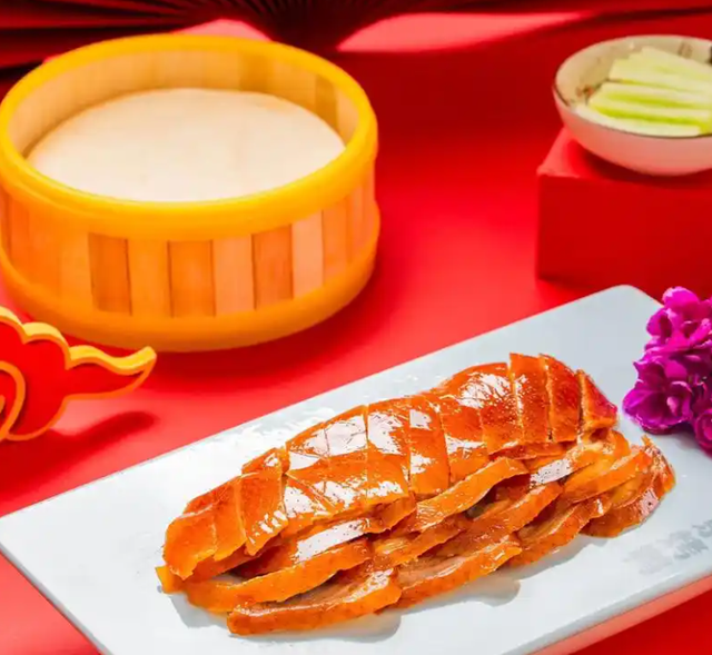 厚味的鸭肉外表焦脆,肉质水灵,配以甜面酱和葱丝,口感丰富。