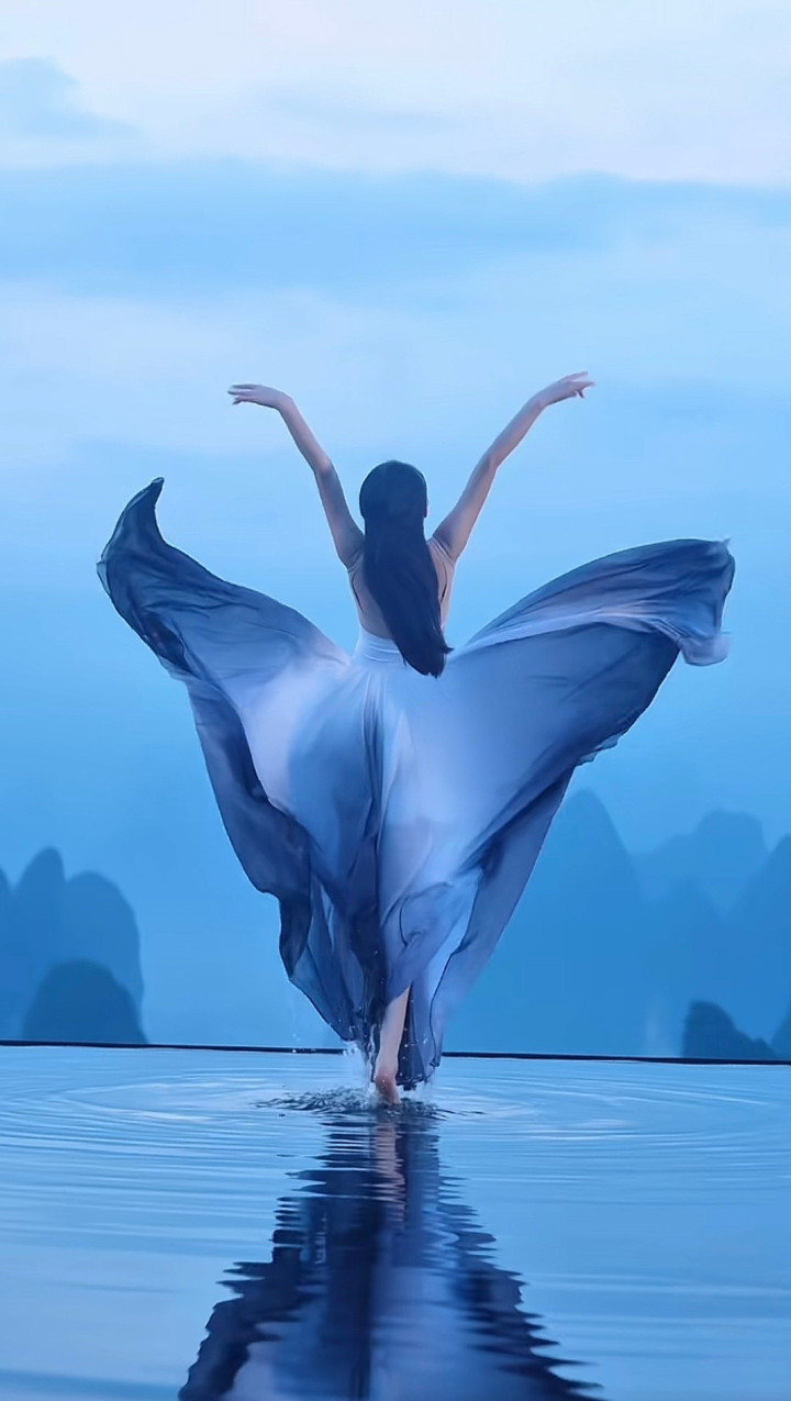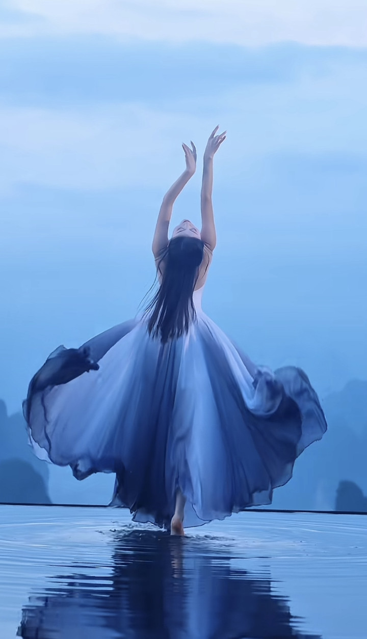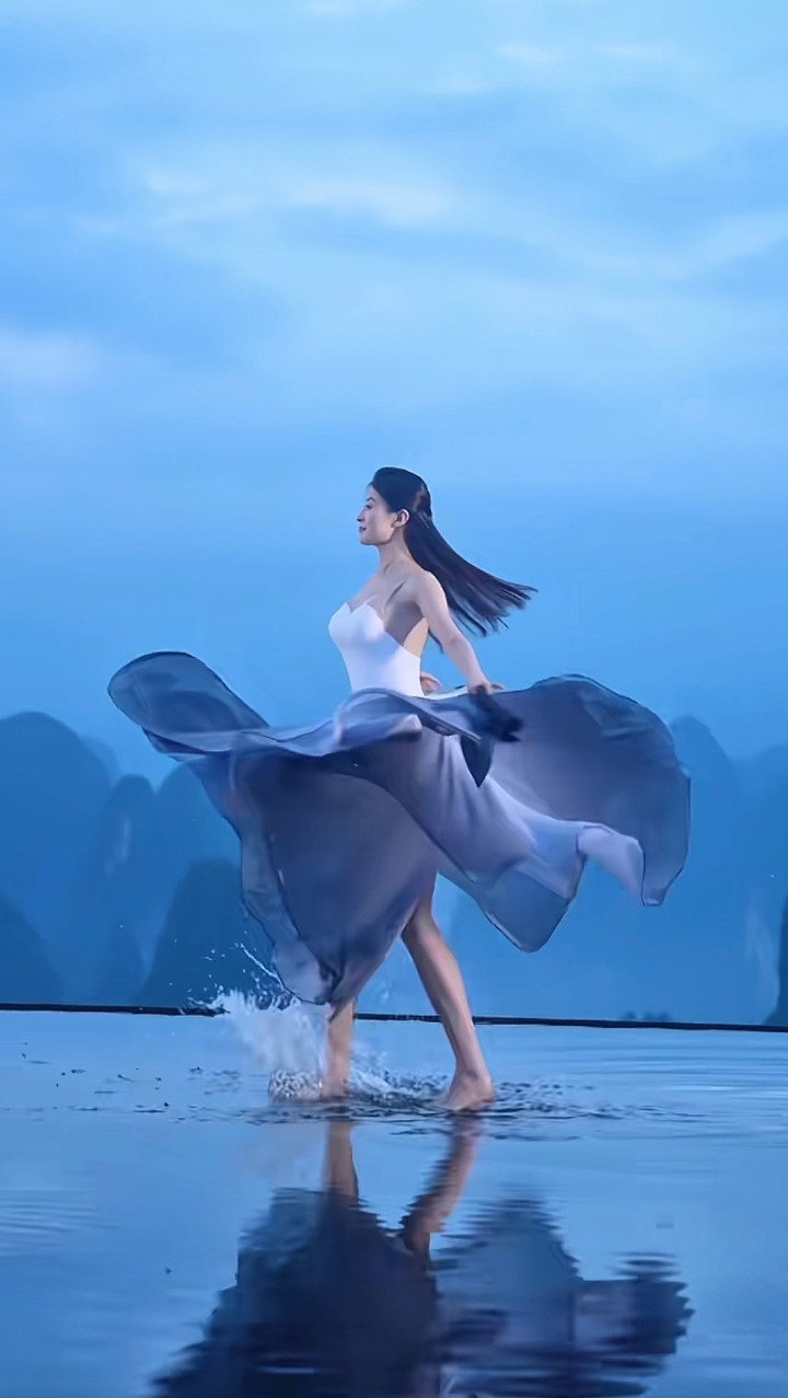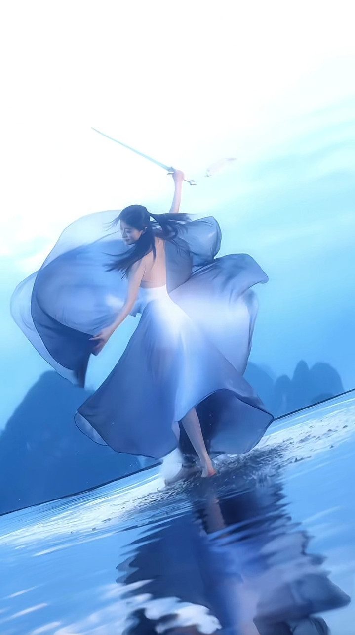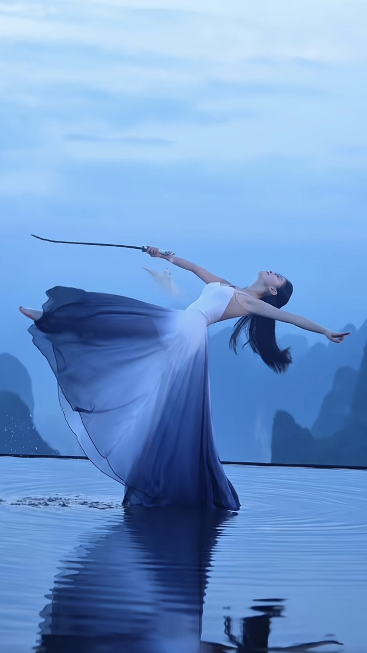 水舞台,以漓江之水为幕,以六合为台,好意思得如梦如幻。粼粼波光,反照着女子婀娜的身姿;辽远的青山,宛如水墨屏风,静默地防守着这场绝好意思的上演。微风拂过,水面泛起涟漪,与女子的剑影相互交汇,仿佛六合皆在为她的跳舞伴奏,奏响一曲空灵震动的乐章。
