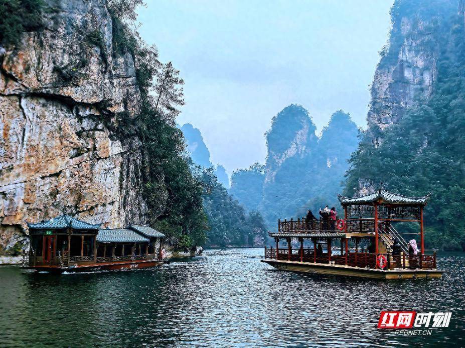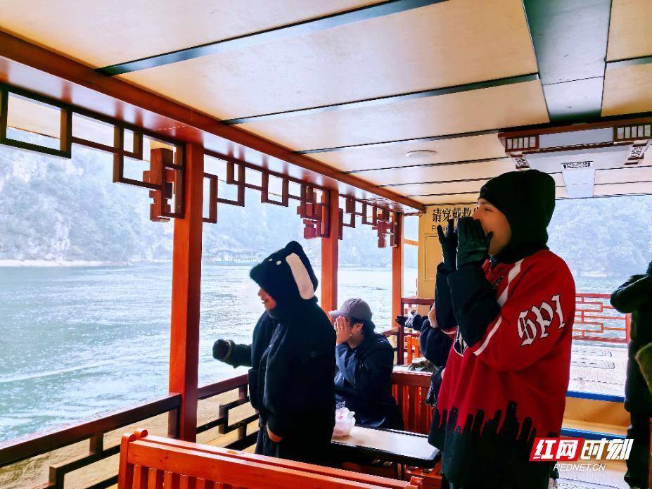 当日上昼,博主们登上环保游船,开启了“东谈主在画中游”的千里浸式体验。游船沿湖冉冉前行,金蟾含月、石门迎宾、宝峰神女等中枢景点按序伸开,碧水如镜、青山如黛,逸态横生间组成一幅自然浑成的山水画卷。博主们纷繁举起拍摄建立,不肯错过这羞花闭月的景致,定格下每一处心动斯须。