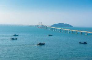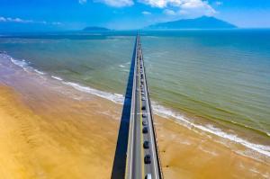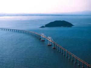 从辽阔看,大桥犹如一条巨龙升起于海上,蔚为壮不雅。