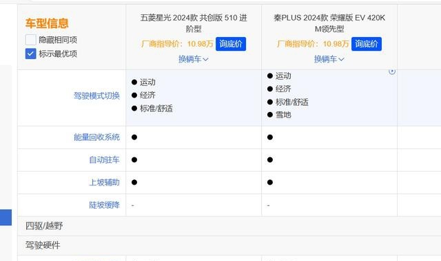 不外仔细了解过五菱星光共创版、比亚迪秦PLUS荣耀版的售价后,却会发现10.98万的价钱分辩能脱手五菱星光共创版 纯电510进阶版这款顶配车型,以及比亚迪秦PLUS荣耀版EV 420km杰出型这款初学车型。这也让不少东谈主产生了敬爱:一样是10.98万预算能买到的电动家轿,五菱星光共创版 纯电、以及比亚迪秦PLUS荣耀版EV有何不同、谁更合算?