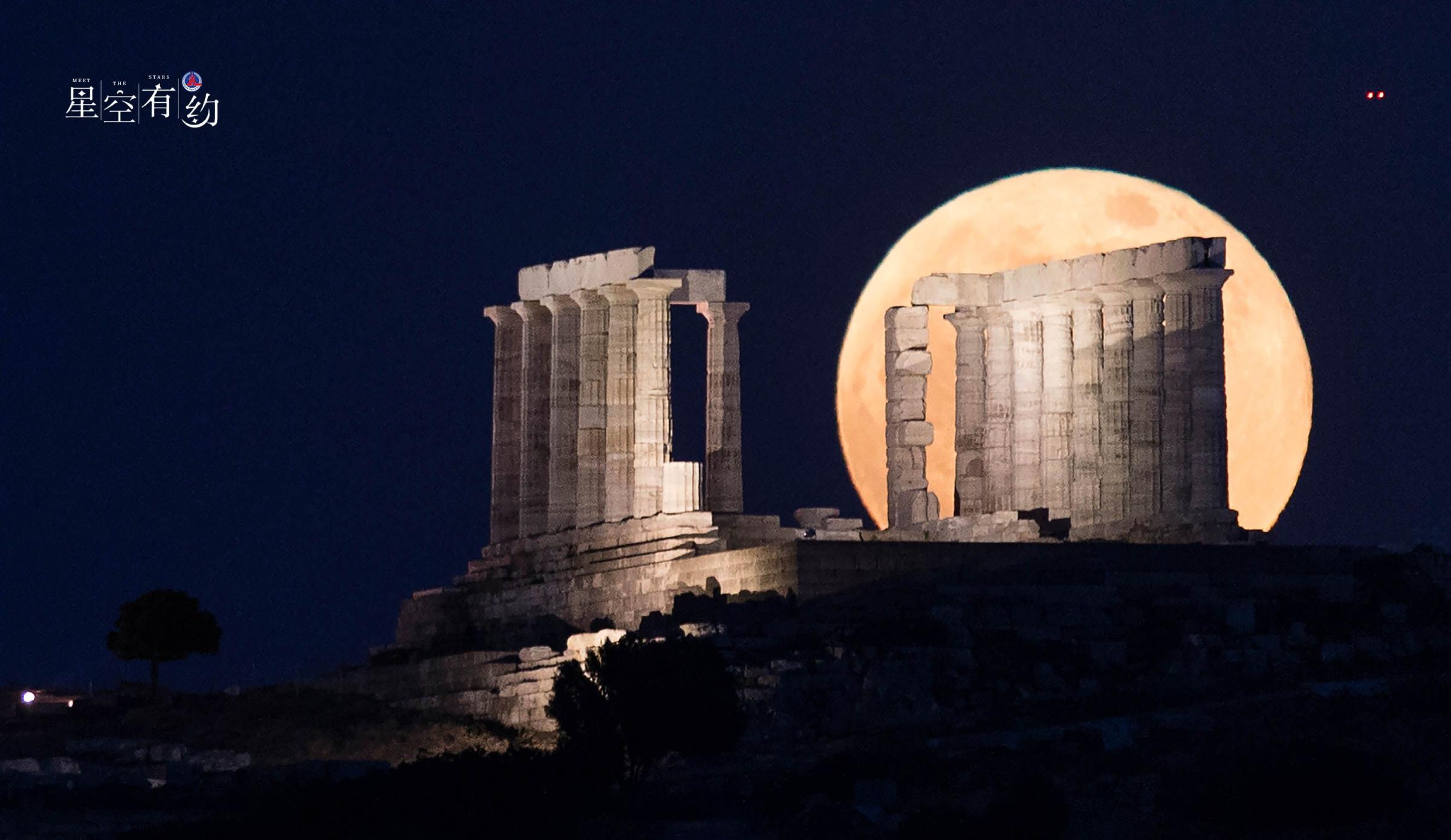 这是2021年5月26日在希腊苏尼翁的海神庙名胜拍摄的年度最大朔月。新华社发(马里奥斯·罗洛斯摄)