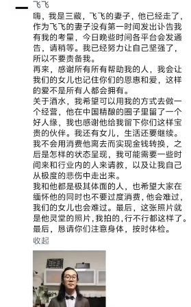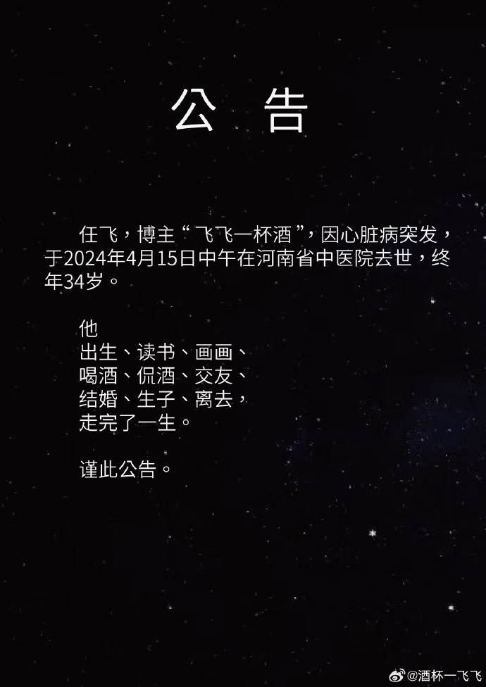 今天(4月17日)傍晚,网红“飞飞一杯酒”的微博顷刻间更新一条黑白公告,执行防卫,写着“任飞,博主”飞飞一杯酒“,因腹黑病突发物化。”