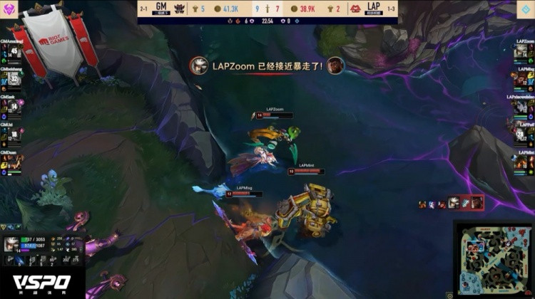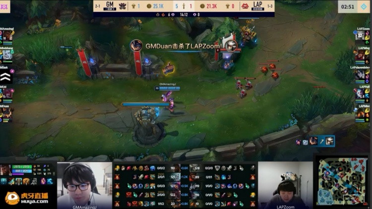 [10:51]下路2V2,兰博凯旋开大联接霞击杀泰坦与金克丝,霞拿到双杀,慧TP来下思杀霞但伤害计较造作,霞6滴血极限锁血莫得就义,乌兹队打出0换2。
