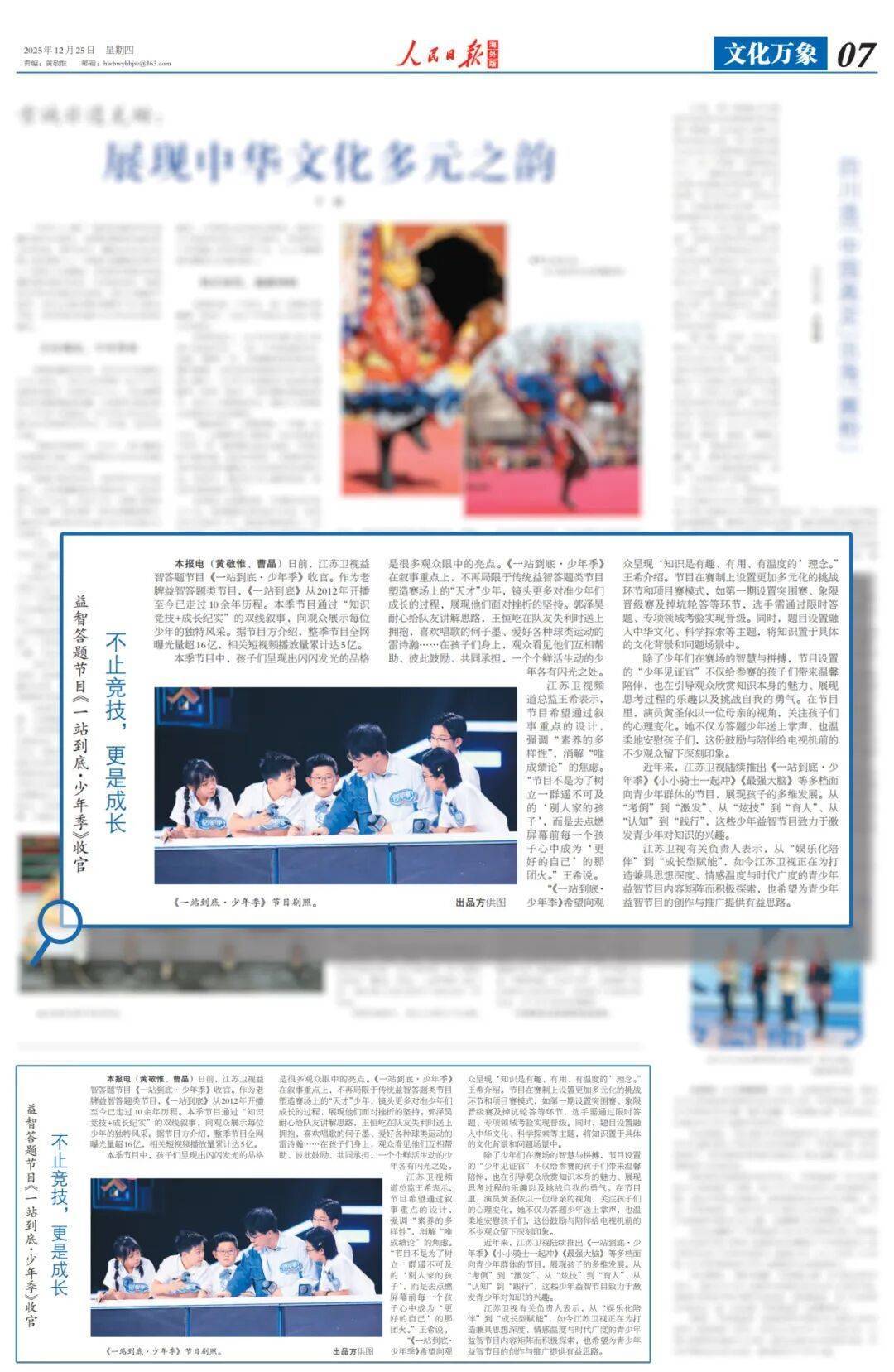 《东谈主民日报国外版》2025年12月25日第07版刊发著作《不啻竞技,更是成长》,详情节目兼具念念想深度、厚谊温度与期间广度,成心于激勉青少年对学问的兴趣兴趣。