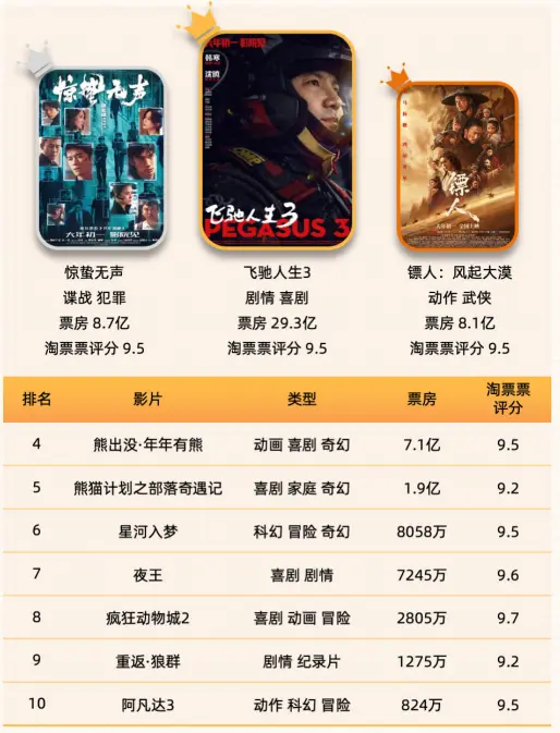 洞见研报在复盘库内多个相似案例后判断,这类鼎沸频繁意味着市集从“限制膨大”向“质料晋升”转型。与2025年春节档比较,2026年档期票房虽略有回落,但影片口碑举座谨慎,淘票票评分9.5分及以上的影片达6部,高质料供给有用对冲了市集波动,印证了“内容为王”的行业内容。