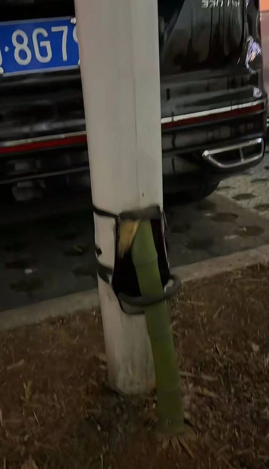 在何先生拍摄的视频中,这棵竹子从大地拔节孕育,根部距离街灯杆仅数厘米,冒出大地约二三十厘米后即从街灯杆根部一个豁口“钻”入灯杆,神奇的是,在长达五六米的街灯杆另一头,一簇竹子枝桠真的在高空冒出,荣华葱郁,令东谈主称奇。