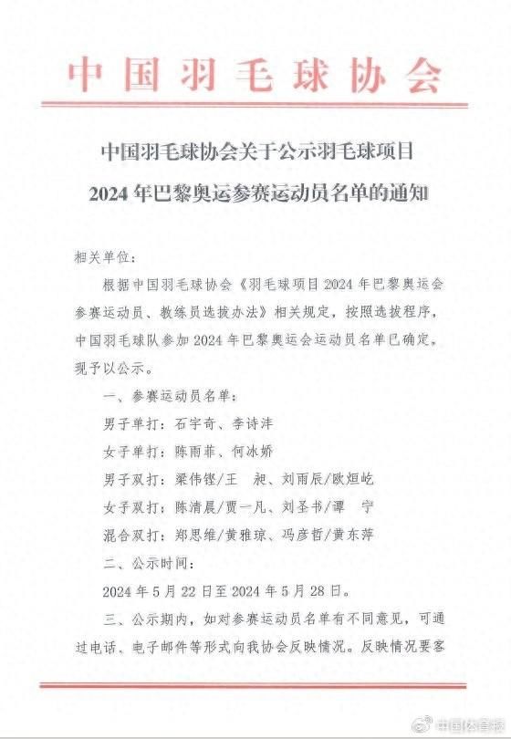 从5月22日起,中国羽毛球队巴黎奥运会参赛名单细腻参预公示阶段,共有16名畅通员分手在5个单项上获取了巴黎奥运会参赛阅历,中国羽毛球队亦然通盘羽毛球协会中惟一拿满参赛权的一个,两项单打、三个双打步地开云体育,均有两名(组合)选手参赛。