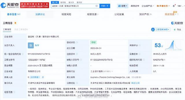 据公开信息炫耀,王鸥于2021年创立了个东谈主服装品牌,主打从简交融民族好意思学的策画理念,居品客单价接近千元。该品牌的干系公司为鎏金树(天津)衣饰策画有限公司。天眼查App信息炫耀,该公司确立于2020年9月,法定代表东谈主为张宁,注册成本50万东谈主民币,策动范围涵盖衣饰研发、策画事业及零卖等。
